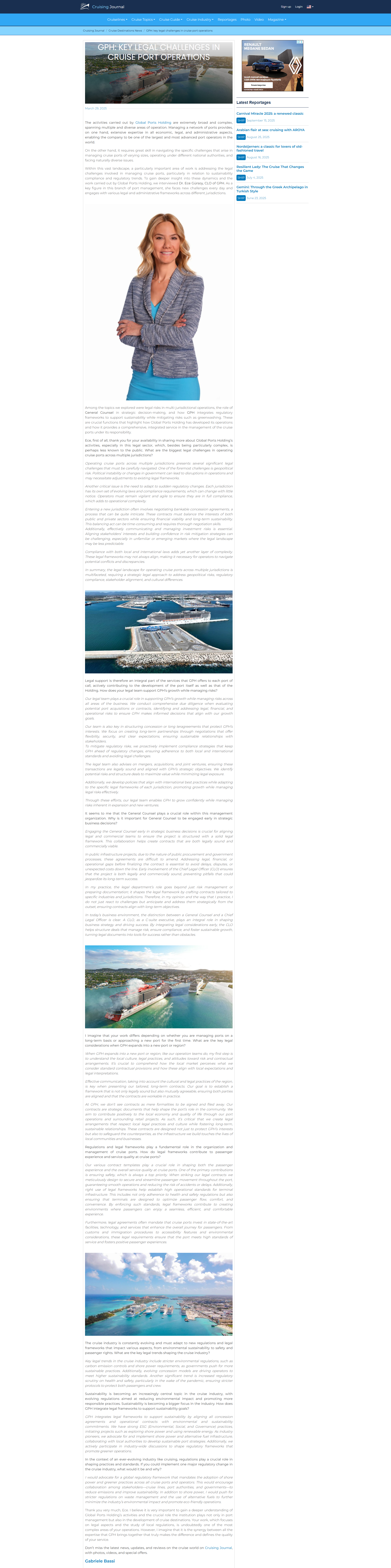 Among the topics we explored were legal risks in multi-jurisdictional operations, the role of General Counsel in strategic decision-making, and how GPH integrates regulatory frameworks to support sustainability while mitigating risks such as green washing. These are crucial functions that highlight how Global Ports Holding has developed its operations and how it provides a comprehensive, integrated service in the management of the cruise ports under its responsibility.