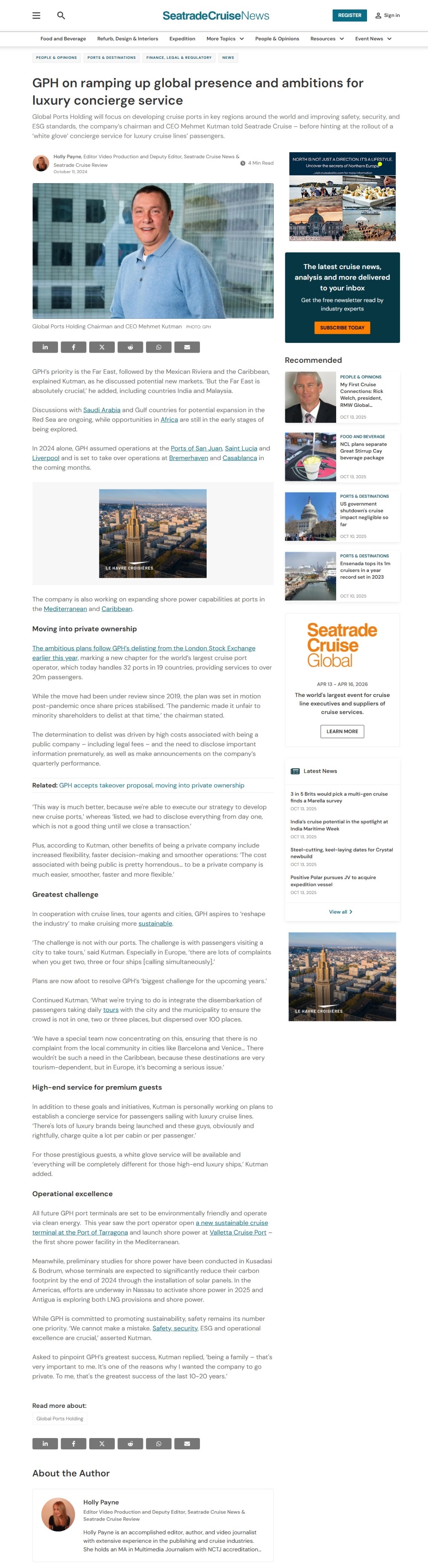 Global Ports Holding will focus on developing cruise ports in key regions around the world and improving safety, security, and ESG standards, the company’s chairman and CEO Mehmet Kutman told Seatrade Cruise – before hinting at the rollout of a ‘white glove’ concierge service for luxury cruise lines’ passengers.